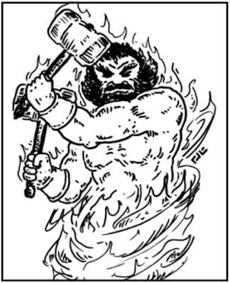 A: Flooded forge w/ 3' deep water. Elevated platform north with disused anvil, furnace and work area, Cyclorc corpse beaten to death. Channel in floor and broken sluicegate to the east once allowed for controlled quenching via river water. Two KAM WARRIORS beneath surface of water attack anyone who enters. One wears Leather Armor +1 and 310 SP in jewelry, one carries Hammer +3 w/ image of Hammerer on the head. Striking the anvil with the hammer summons two FIREWALKERS who help clear the dungeon of monsters.
